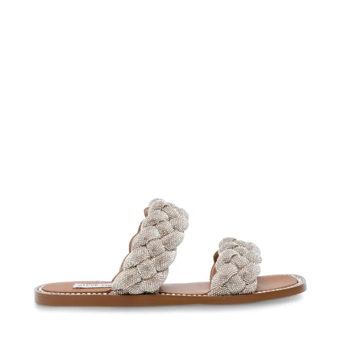 The Newbie slide sandal infuses a touch of glamor to your casual, warm weather style. The tightly braided straps and footbed are decorated with stones to exude a sparkly vibe with every step.